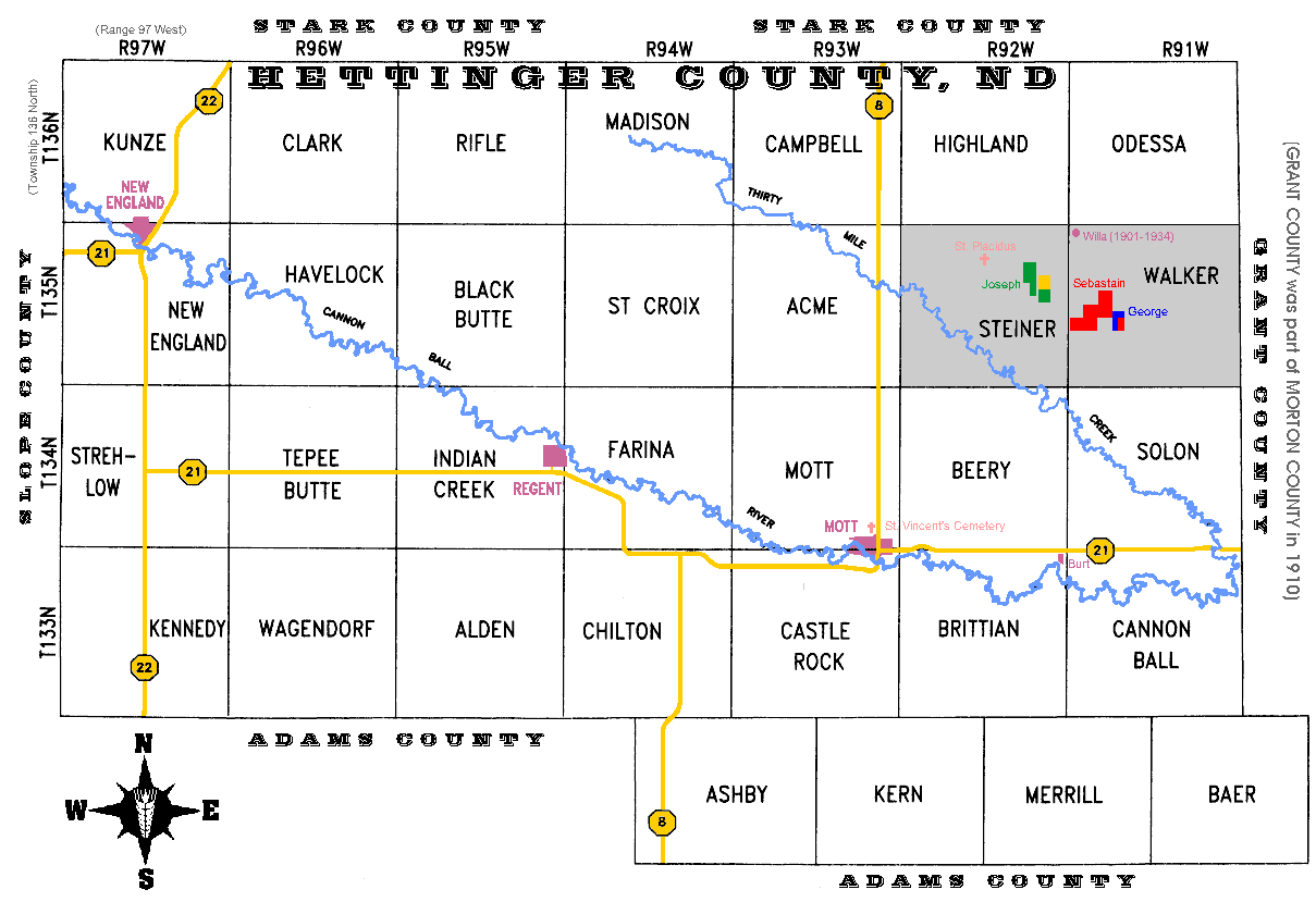 HETTINGER COUNTY, NORTH DAKOTA MAP WITH TOWNSHIP NAMES AND RANGES