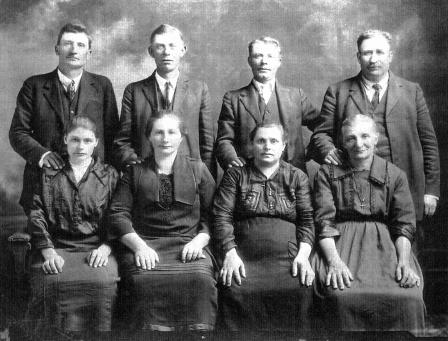 Four of their six children are pictured with their wives. This picture was taken prior to 1913, as daughter, Anna, had died that year. She was married to Joe BLETH. Also not pictured are son, Michael and his wife Katherine REICHERT. From left to right are Peter and Mary DINIUS KOFFLER, Anton and Emelia FISCHER KOFFLER, Joseph and Magdalene SCHWINDT KOFFLER and Sebastian and Juliana KOFFLER LANTZ ROLL. Juliana's first husband, John LANTZ, died in South Russia. She emigrated around 1903 to North Dakota