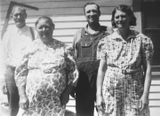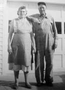 a) Mike & Rosa with neighbors, Mike & Amelia Hellman b) Sons, Bill and Seb, with a lamb on the farm. c) Mike & Rosa with daughters at Glady's wedding d) Plowing snow on the farm.