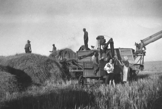 From left to right: Unknown, Unknown, Mike ROLL [standing on thresher], 3 unknown kids, a visitor with her baby and Rosa REICHERT ROLL.