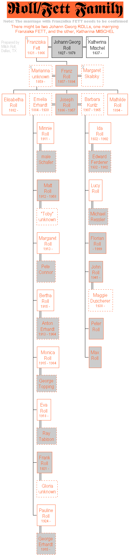 Listed below are the decendent children (Blue, Red, Gold*, and Green Teams) and ancestors/cousins (Orange, Purple, Turquoise, Black and Silver Teams) of Johann Georg ROLL (1827-1878) and wifes, Franziska FETT b. 1821 and Katherina MISCHEL (1836-). The ROLL Reunion organizers and volunteers are divided into 10 families/teams: