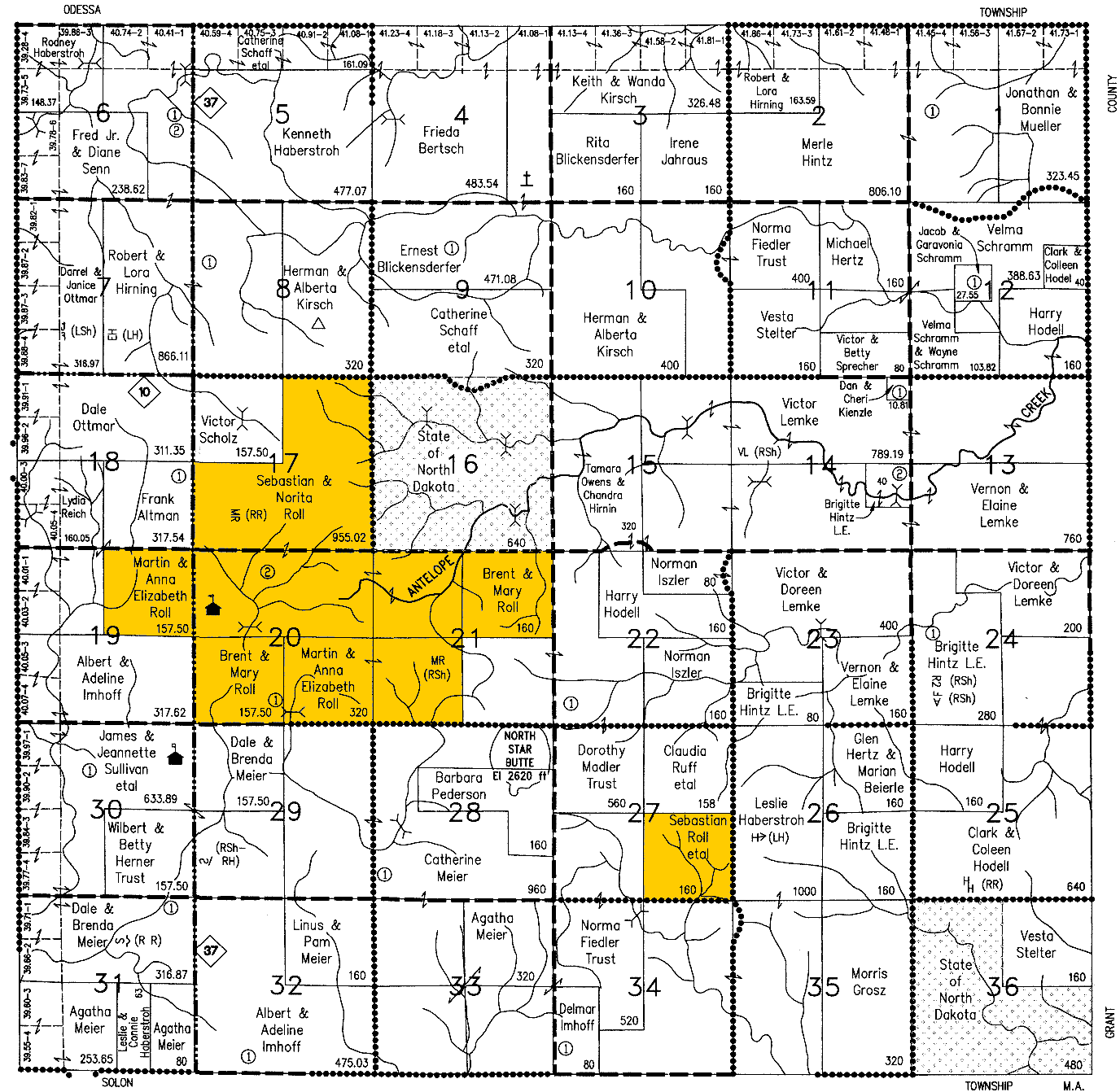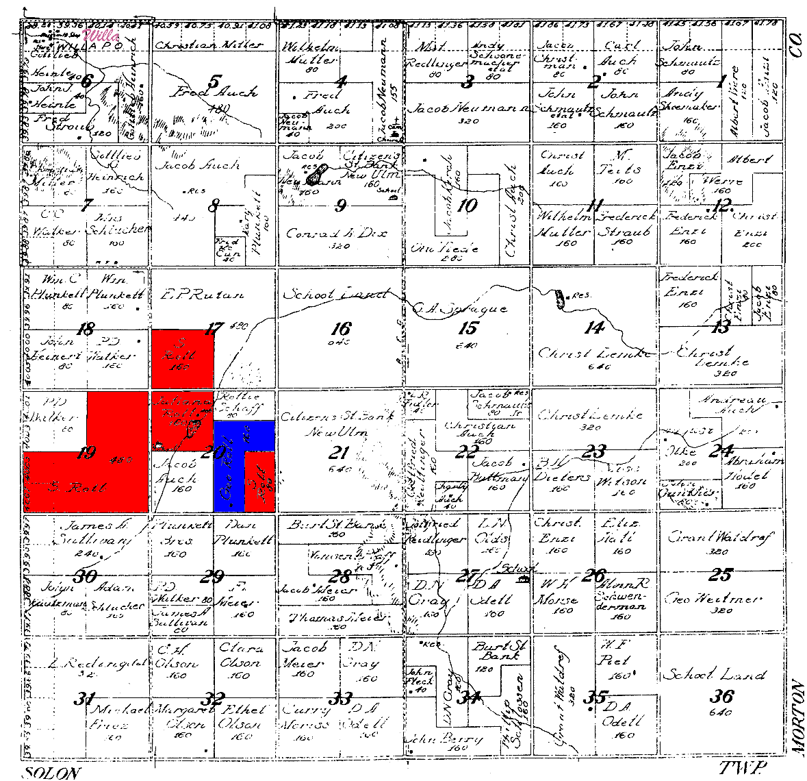 In 1910, George ROLL (1867-1938) owned the blue-shaded area in section 20, and Sebastian ROLL (1873-1930) owned the red-shaded areas in sections 17, 19, and 20. Notice Willa was located north of the homesteads in section 6.