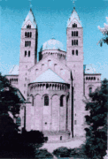 The Diocese of Speyer (Spira) in Bavaria (now Rhineland-Pflaz) has two patron saints: St. Maria and St. Stephan. The city of Speyer dates back to the stronghold of Noviomagus, in the territory of the German tribe of the Nemetes, on the left bank of the Rhine. In the course of time a Roman municipality (Colonia Nemetum) developed out of this stronghold; in 451 the municipality was entirely destroyed by Attila. From its ashes arose a new city, Spira of Speyer. Christianity found entrance into the city in the time of the Romans. The first bishop, Jesse (Jessius), is mentioned in the Acts of the synods of Sardica (343) and of Cologne (346), but his historicity is not quite certain. On the other hand there is positive proof of Bishop Hilderich who attended the Synod of Paris held in 614. Since his episcopate the succession of bishops has been unbroken. In 748 Speyer was made suffragan of Mainz; and in 1030 the first stone of the present Romanesque Cathedral of Our Lady was laid; it was intended to be the mausoleum of the Salian emperors. The church was consecrated in 1061.