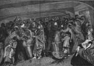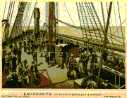 a) 1852 - Bay view of Port Bremen, Germany. b) 1907 - Emigrants exiting the trains (left) and boarding a ship (right) at Port Bremen, Germany. c) 1920 - Bremen port. d) & e) 1891 - Emigrants on the deck of an Atlantic Passinger Ship. Bremerhaven, situated at the river Weser, is the seaport in Germany with the most intensive relations with America. After 1832 it became the central harbor for the mass immigration from central Europe to the USA. It was, besides Hamburg, the main harbor for the regular passenger's traffic across the Atlantic by steamships.