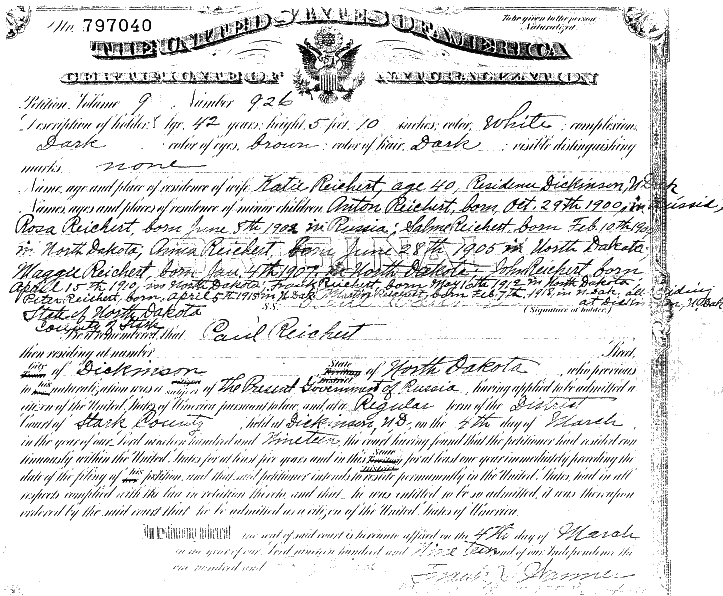 1919 - USA CERTIFICATE OF NATURALIZATION of the Paul REICHERT (1877-1954) family.