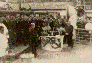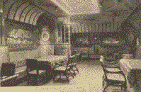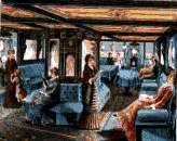 a) 1872 - Serving food to the emigrants in the galley. Late 1800's aboard a North German Lloyd ship - b) Men enjoying a smoke in the Gent's Room and c) women refreshing in the Ladies Cabin. d) 1897 - Smoke Room aboard Kaiser Wilhelm der Gross. e) & f) Early 1900's North German Lloyd Captain Ceremonies. g) North German Lloyd Flag.