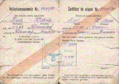Ethnic German certificate (Volkstumsausweis) issued on October 4, 1942 to Martz HILHELEU (not related to the ROLL family) who was born in the town of Berezovka (Odessa region). According to this certificate, he is Volksdeutscher - ethnic German. The certificate is written in two languages: German and Romanian. During WWII the Ukrainian territory (between the Dnestr and Bug rivers) was under German and Romanian occupation and the Romanians created a district (called Transdniestria) with the capital in Odessa. After 1944 the Red Army liberated the territory from Germany. By order of Chief of Staff, Comrade Stalin, all ethnic Germans from the Odessa region were deported to North Kazakhstan and allowed to return only in late 1970's.