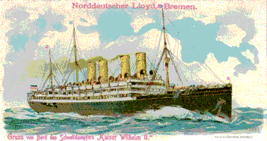 and Adam S. MISCHEL sailed on this ship from South Russia (via the port of Bremen, Germany) to New York; then on to North Dakota, USA by train. a) KAISER WILHELM II at New York Harbor in 1910. b) At sea in 1907, KAISER WILHELM II was built by North German Lloyd, a German ship company. c) 1914 portrait of Kaiser Wilhelm the II of Germany.