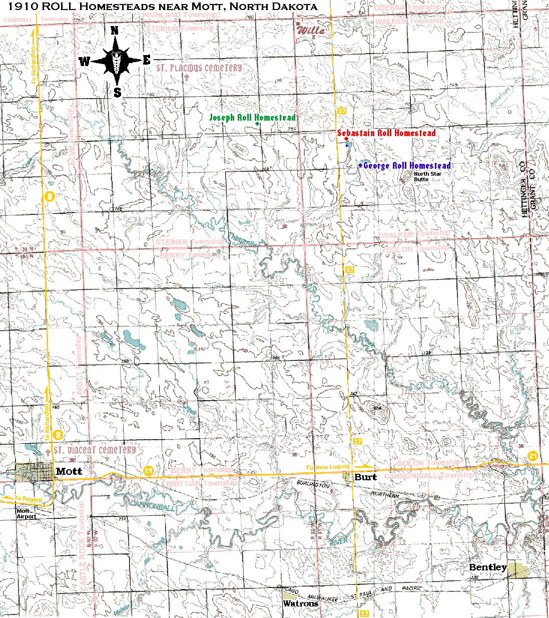 MAP OF THE MOTT/BURT, NORTH DAKOTA AREA WHERE THE THREE EMIGRANT ROLL BROTHER'S HOMESTEADED.