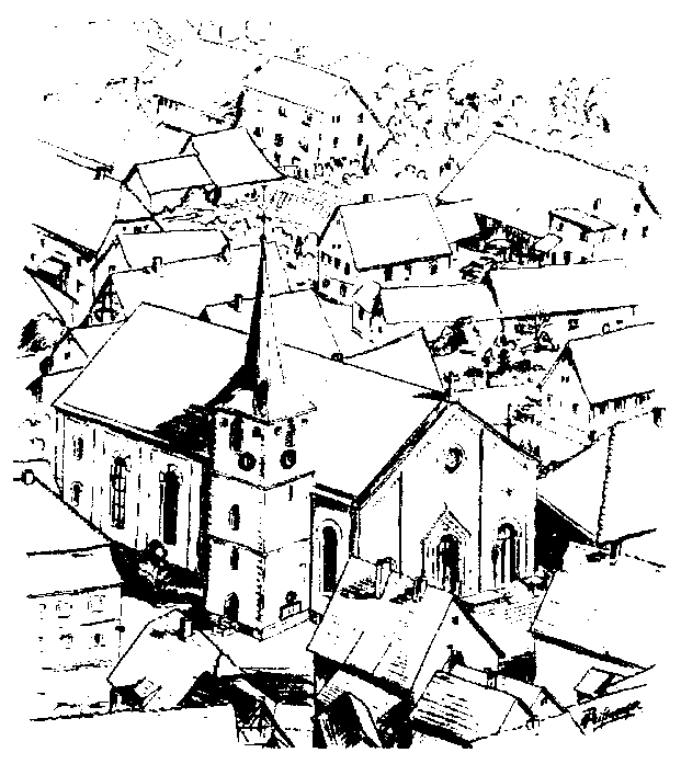 It was not before 926 (after the attack of the Hungarians) that in the books of the monastery Weißenburg in Alsace (now northeast France; also spelled "Elsace") the town-name Kirchhusen is mentioned for the first time. The writings say there were devastated farms that got burned down by the Hungarians. Even a church building is mentioned there. But no one knows how long it had already been there in those days. After the devastation, Kirchhausen was part of the possession of the Earl of Calw. After a very eventful history, Kirchhausen eventually became a part of the German Order in 1433. In 1486 the feudal lords, Eberhard and Wilhelm, of Neipperg renounced their rights in Kirchhausen, in favor of their brother Knight of the German Order Reinhard of Neipperg. So Kirchhausen became a part of his possession. The description of the parishes from 1582/83 the parish of Kirchhausen is said to have belonged to the bishopric of Worms (till 1817) and had already been 400 years old. According to the Worms synod-book, even the old church that was built in 1468 and torn down in 1841 had St. Alban as a patron saint. The tower on the west side of today's church, which is 3 stories high, is still from that time and has a pointed slate roof. The 2nd and 3rd story has late Gothic sound openings in the keel bow and under the roof cornice, the number 1579 is carved. The pointed tower door was the entrance to the old church looking to the east.