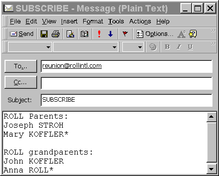 In December 2001, we started a ROLL Family and Reunion listserve. A listserve allows you to send emails to an entire group of people at one time. Make sure to add the ROLL listserve email address, reunion@@rollintl.com, to your email address book. Simply place this address in your "To" line, add a title to your "Subject" line, as described below, and began writing your email to us.