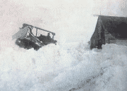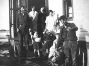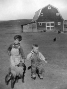a) Mike & Rosa with neighbors, Mike & Amelia Hellman b) Sons, Bill and Seb, with a lamb on the farm. c) Mike & Rosa with daughters at Glady's wedding d) Plowing snow on the farm.