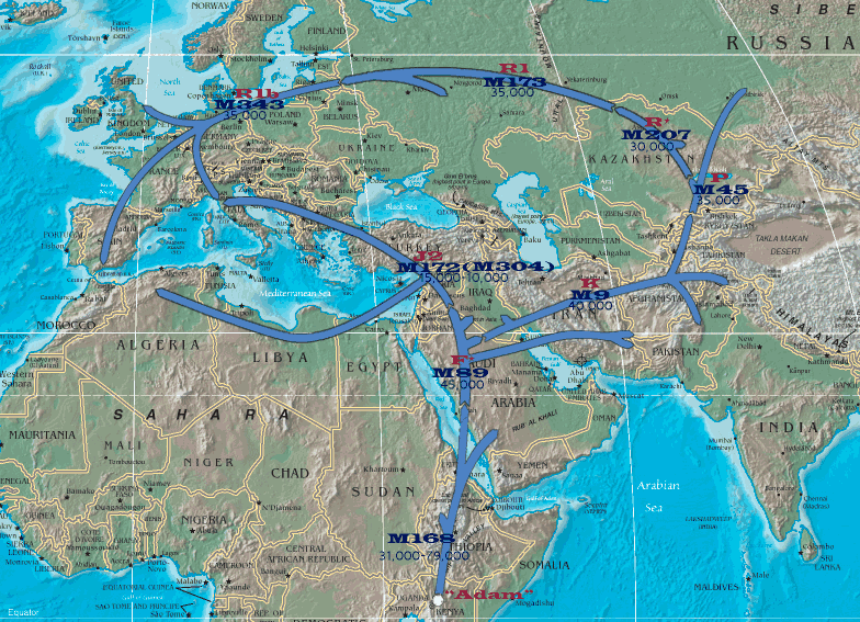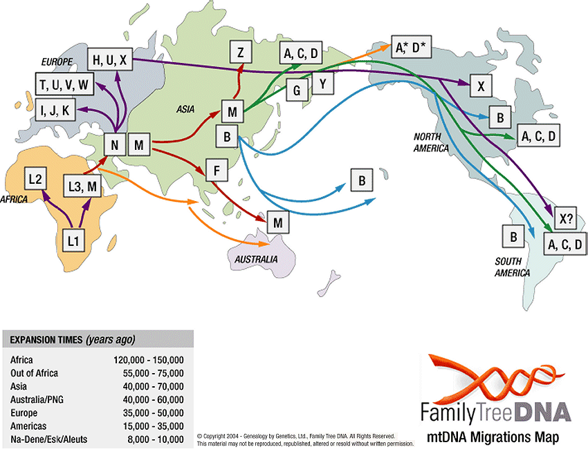 Listed below is a map detailing the expansion of the human race. It is genetically proven that most of the world is related to one tribe in Africa, which had migrated to the mid-east, then to Kazakhstan, then worldwide, including Europe, Asia, Americas, etc.