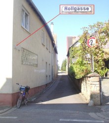 discovered the small "Rollgasse" lane. "Gasse" = "Lane". I asked an old man about the origin of the name. He said he did not know the exact reason, but thought it came from the fact you can roll down the lane. The lane is a very narrow 2 meters and ends in a field. In earlier times the farmers shoved their wheelbarrels up this lane without without requiring much effort. This could be an explanation."